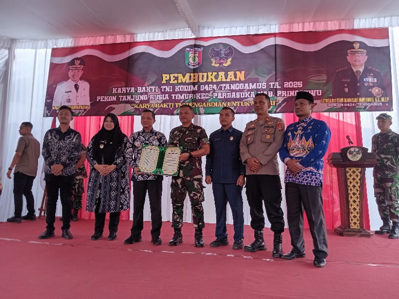 Pringsewu (alodelima.com) – Karya Bakti TNI Kodim 0424/TGM di Pekon Tanjung Rusia Timur, Kecamatan Pardasuka, Kabupaten Pringsewu secara resmi dibuka oleh Bupati Pringsewu Riyanto Pamungkas di Balai Pekon setempat, Jumat (01/08/2025). Pembukaan ditandai dengan penandatanganan naskah serah terima kegiatan antara Bupati Pringsewu dengan Dandim 0424/TGM Letkol Inf.Dwi Djunaidi Mulyono. Turut diserahkan bantuan sembako kepada warga yang membutuhkan.