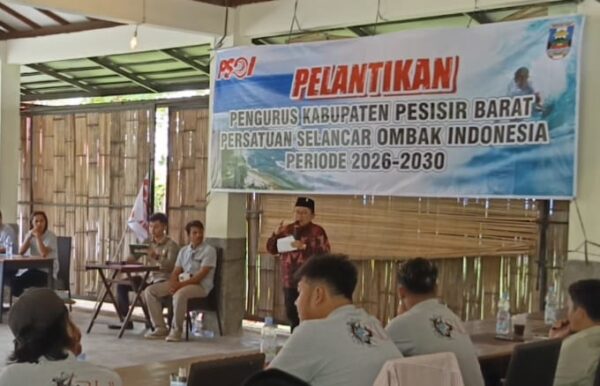 Pesisir Barat (alodelima.com) – Untuk pertama kalinya, pengurus Persatuan Selancar Ombak Indonesia (PSOI) Kabupaten Pesisir Barat resmi dilantik. Pelantikan pengurus masa bakti 2026–2030 tersebut berlangsung di Aula Jimbaran Resto, Pekon Walur, Kecamatan Krui Selatan, Kamis (12/2/2026).