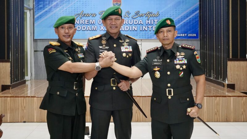 Metro (Alodelima.com) – Pangdam XXI/RI Mayjen TNI Kristomei Sianturi, S.Sos., M.Si.(Han), memimpin langsung upacara Serah Terima Jabatan (Sertijab) Komandan Korem 043/Garuda Hitam (Danrem Gatam) dari Brigjen TNI Haryantana, S.H., kepada pejabat baru Kolonel Inf Sumarlin Marzuki., S.E .M.Han., Upacara digelar khidmat di Makorem 043/Gatam yang beralamat di Hadimulyo Barat, Kecamatan Metro Pusat, Kota Metro.