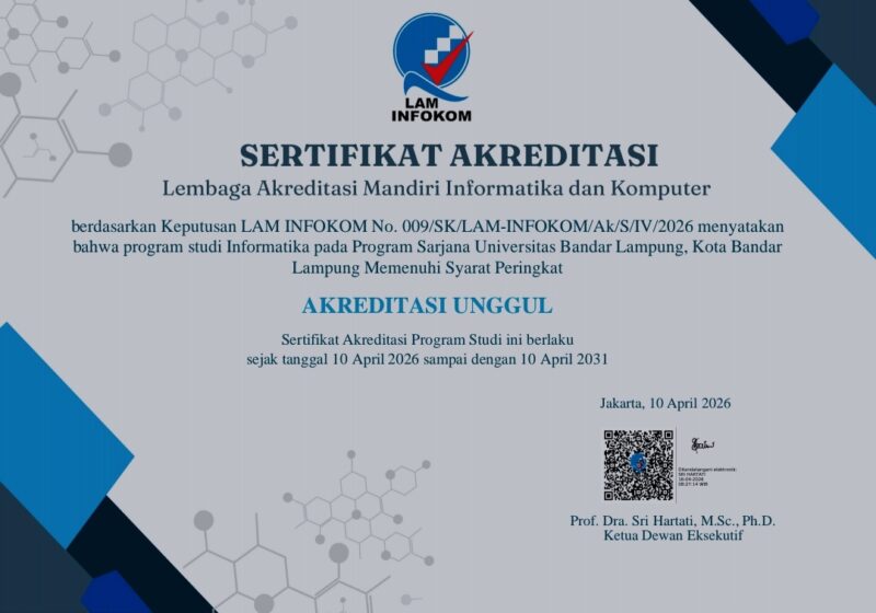 Bandar Lampung (alodelima.com) — Universitas Bandar Lampung (UBL) kembali mencatatkan capaian strategis dalam penguatan mutu pendidikan tinggi. Program Studi Informatika pada jenjang Sarjana (S1) resmi meraih peringkat Akreditasi Unggul, berdasarkan Keputusan Lembaga Akreditasi Mandiri Informatika dan Komputer (LAM INFOKOM) Nomor 009/SK/LAM-INFOKOM/Ak/S/IV/2026.