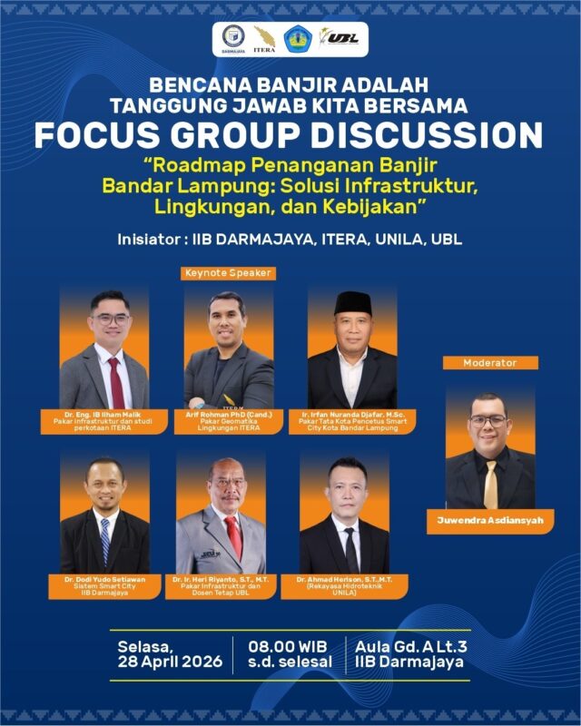 BANDAR LAMPUNG (Alodelima.com) – Institut Informatika dan Bisnis (IIB) Darmajaya menginisiasi kegiatan Focus Group Discussion (FGD) bertajuk “Roadmap Penanganan Banjir Bandar Lampung: Solusi Infrastruktur, Lingkungan, Smart City, dan Kebijakan Terpadu” yang akan digelar pada Selasa, (28/4/26) di Aula Rektorat IIB Darmajaya.