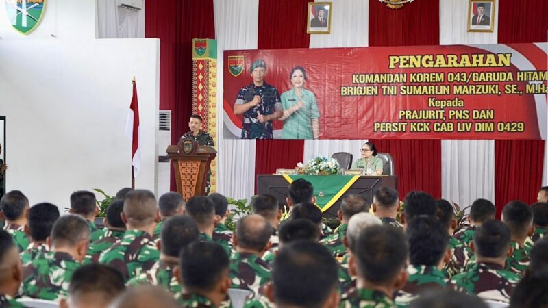 Lampung Timur (Alodelima.com) — Komandan Korem (Danrem) 043/Garuda Hitam, Brigjen TNI Sumarlin Marzuki, S.E., M.Han., menekankan pentingnya menjaga kesehatan serta menghindari berbagai bentuk pelanggaran saat melaksanakan kunjungan kerja ke Kodim 0429/Lampung Timur, Senin (27/4/2026).